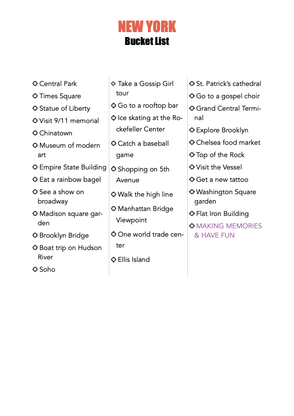 Bevor mein Abenteuer beginnt, habe ich eine Liste erstellt mit all den Dingen, die ich während meines Aufenthalts in New York unbedingt erleben und sehen möchte. Viele dieser Punkte gehören zu den typischen Touristenattraktionen, aber sie müssen meiner Meinung nach einfach gesehen werden. Doch der wichtigste Punkt auf meiner Liste ist "Erinnerungen schaffen und Spaß haben".